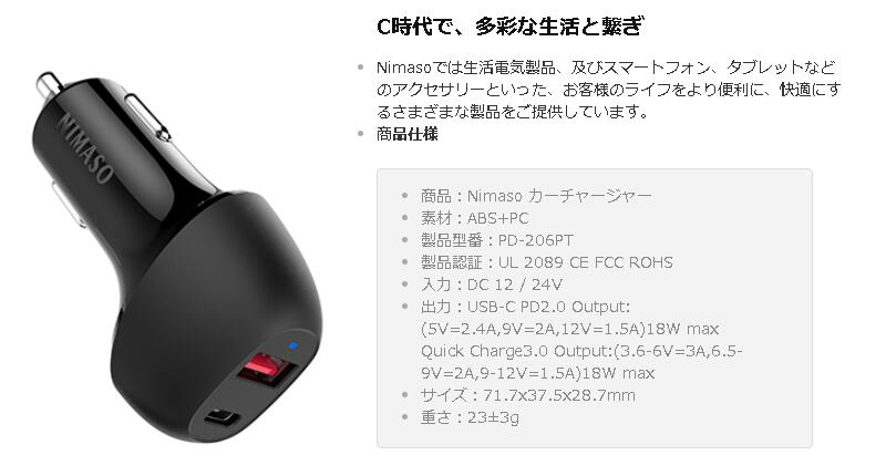【楽天スーパーSALE限定5%OFFクーポン】【18ヶ月保証】Nimaso カーチャージャー シガーソケット 2ポート 車載充電器 Quick Charge 3.0 & Power Delivery2.0対応 36W 急速充電 iPhone/iPad/Galaxy/Huawei/Xperia その他Android各種対応 (Type C to Type C ケーブル付き)