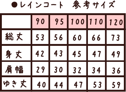 【オレンジボンボン】 Orange Bonbon●素材 ポリエステル100% (一部ポリ塩化ビニル樹脂使用) 表示サイズ 参考年令 身長 体重 帽子(表示) シューズ・ソックス 50 新生児 50(cm) 3(kg) 42(cm) 6-7(cm) 60 3ヶ月 60(cm) 5(kg) 44(cm) 8-11(cm) 70 6ヶ月 70(cm) 9(kg) 46(cm) 11-13(cm) 80 1歳 80(cm) 11 (kg) 48(cm) 12-14(cm) 90 2歳 90(cm) 13 (kg) 50(cm) 13-15(cm) 95 3歳 95(cm) 14 (kg) 52(cm) 13-15(cm) 100 4歳 100(cm) 16(kg) 54(cm) 15-16(cm) 110 5歳 110(cm) 17(kg) 54(cm) 17〜18(cm) 120 5歳 120(cm) 17(kg) 54(cm) 18〜19(cm)【オレンジボンボン】 Orange Bonbon