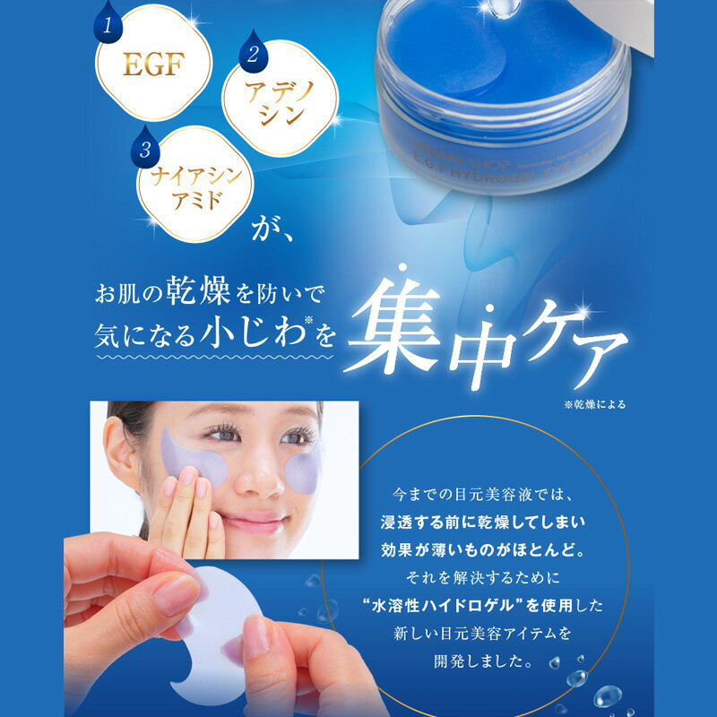 商品名 DERMAK SHOP(ダーマルショップ) E.G.F水溶性ハイドロゲルアイパッチ 内容量 60枚入り(30ペア) 商品説明 話題のE.G.Fを0.1ppm配合し、浸透性の高い水溶性ハイドロゲル使用した目元美容アイテムです。
